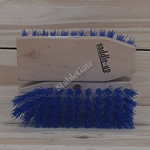 A small, easily held brush with stiff strong synthetic bristles and a tapered front.