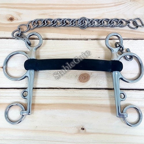 The snaffle rein has a more direct contact with the horse’s mouth. The rubber mullen mouthpiece is softer than a jointed mouthpiece.
