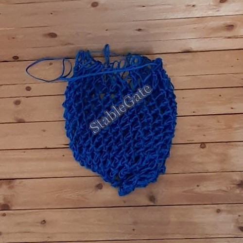 Slow feeder hay nets are made from a durable cord with a draw string opening.