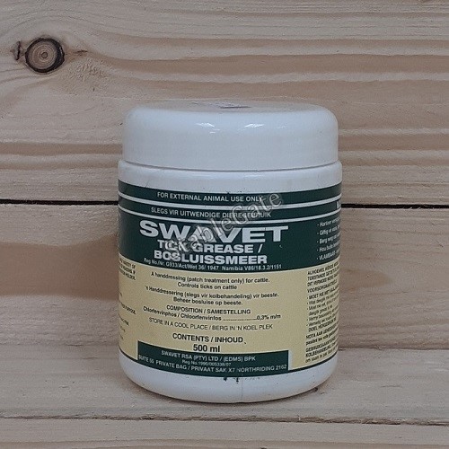 Use only as directed. This remedy is for patch treatment only. Apply the Swavet Tick Grease thinly and evenly by means of a brush or gloved hand, into ears and onto bare patches where ticks tend to cluster, when necessary.